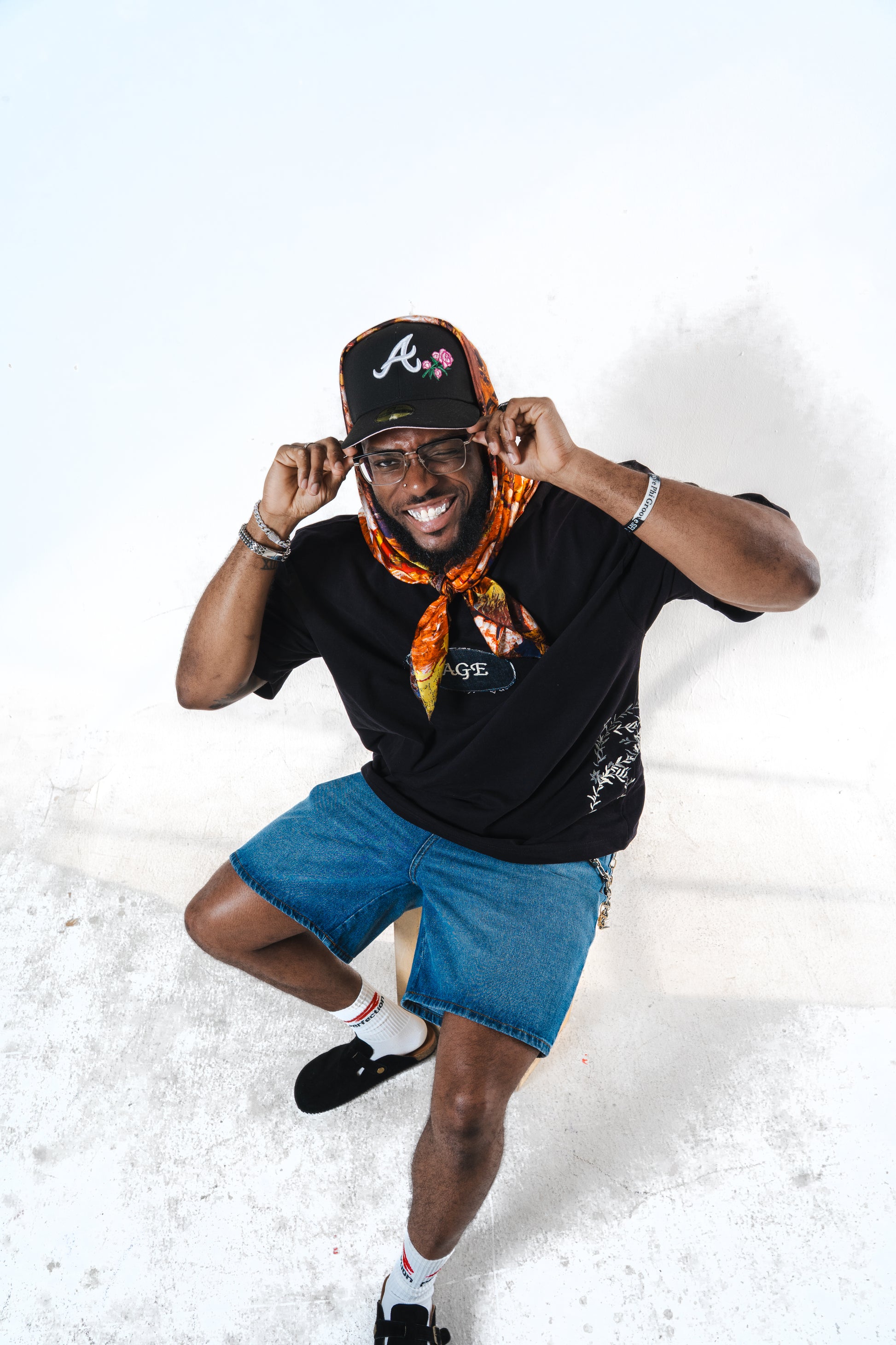 - Spandex Mock-neck tee with a boxy, oversized drape with Sage Denim Patch and floral embroidery on side.